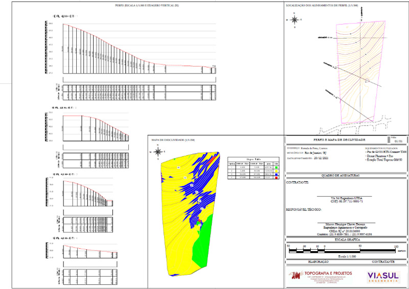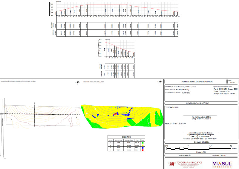 Levantamento topográfico para projeto de condomínio residencial em Cosmos/RJ com layout padrão e sobreposto com a Ortomosaico, perfis longitudinais e mapa de declividade.
